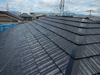 施主様としてはより耐久性に優れるスペックを希望されていた為、今回はモニエル瓦をエースペイント社の「モニエルサン瓦」の施工前下地材で塗り、仕上げ材は弱溶剤系2液型の「ファインシリコンフレッシュ」とし、外壁は微弾性フィーラー&水性シリコン樹脂の「オーディフレッシュsi100」とさせていただきました。(H様より) |