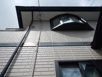 | 施工前 窯業系デザインサイディングは若干のチョーキングが見られます。 | 施工前 軒樋・縦樋は紫外線の影響で艶引け・褪色が進み、塩ビ製の樋は劣化が進んでいます。 | 施工前 サイディングの板目字&サッシまわりのシールはまだ弾力を失っていませんが、今後の事を考慮し全面的な打ち替えとさせていただきました。 |