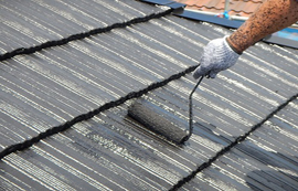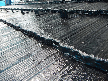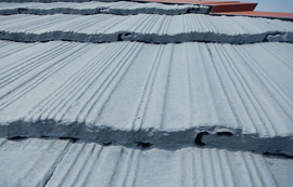 ネットよりお申し込みをいただいたお客様の屋根はモニエル瓦の平型タイプでした。モニエル瓦には山型と平型の2タイプがありますが、今回はエースペイントの「サン瓦」の下塗り・中塗り材を使用し、仕上げは日本ペイントの弱溶剤系2液型「ファインシリコンフレッシュ」をご提案させていただきました。 最も大事な工程は基材に載っている劣化したカラースラリー層を除去することにあり、高圧洗浄機で時間を掛けながら丁寧に作業を進めます。もし、脆弱なスラリー層が残ってそのまま塗装した場合、専用シーラーを塗っても密着不良を起こして剥がれの原因になりかねません。 今回の仕様の場合、密着性のいい「エクセルシーラー」を2回ローラーで塗布し、水性カチオン系の「エクセルガード」を塗布してから仕上げ材の塗布に掛かります。この厚膜型の「エクセルガード」は仕上げ塗膜を通過した水分を遮断し、カラースラリー層を溶かして剥離することを防止する為の中塗り材です。合計5回塗りの手間の掛かる作業ですが、塗膜剥離が問題となりやすいモニエル瓦の塗り替えには重要な工程です。 |
